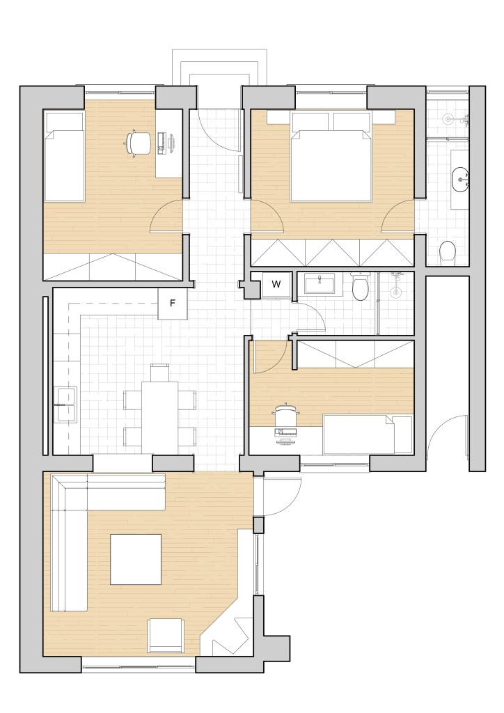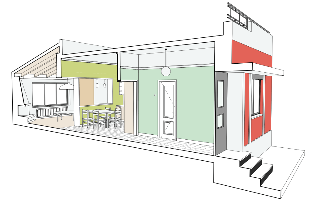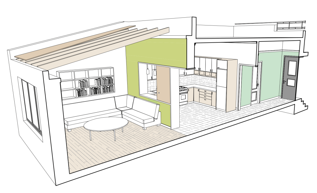 Ραχοκοκκαλιά της πρότασης αποτέλεσαι ο τοίχος που διαχωρίζει την κουζίνα με το καθιστικό. Ο τοίχος αυτός στον παρελθόν ήταν ο εξωτερικός τοίχος της κατοικίας και επικοινωνούσε με την αυλή. Σε δεύτερη φάση κατασκευάστηκε ο χώρος του καθιστικού.