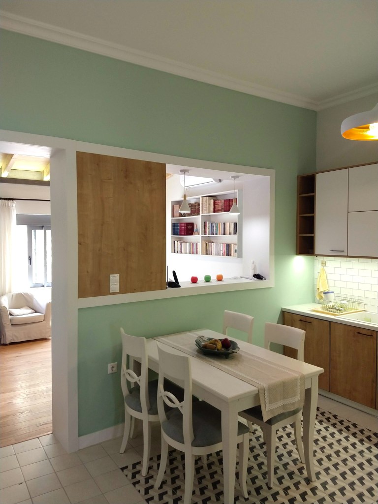 Παράληλλα λόγω του στατικού της ρόλου (φέρουσα τοιχοποιϊα) ήταν αδύνατο να φέρει μεγάλα ανοίγματα. Πρόθεση του σχεδιασμού ήταν το άνοιγμα επικοινωνίας και το παράθυρο του τοίχου να παραπέμπουν σε εξωτερικό τοίχο κατοικίας. Ο ζωηρός χρωματισμός και οι ξύλινες επενδύσεις εξυπηρετούν τον σκοπό αυτό.